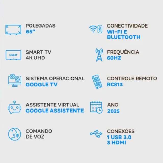 A Smart TV TCL 65P7K vem equipada com 3 entradas HDMI, 1 entrada USB, saída digital óptica, LAN RJ45 e Bluetooth 5.4, oferecendo ampla conectividade para todos os seus dispositivos. Seja para conectar videogames, soundbars ou reprodutores externos, ela está pronta para qualquer ocasião. E para completar a experiência, seu sistema de som Dolby Atmos com 20W de potência RMS entrega áudio imersivo e de alta fidelidade, transformando sua sala em um verdadeiro cinema.