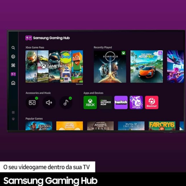 Para os gamers, é uma aliada de respeito. Com Auto Game Mode (ALLM), HGiG, Gaming Hub e taxa de atualização de até 60Hz via HDMI, os jogos ganham baixa latência, gráficos otimizados e uma performance que faz diferença tanto no console quanto via nuvem.