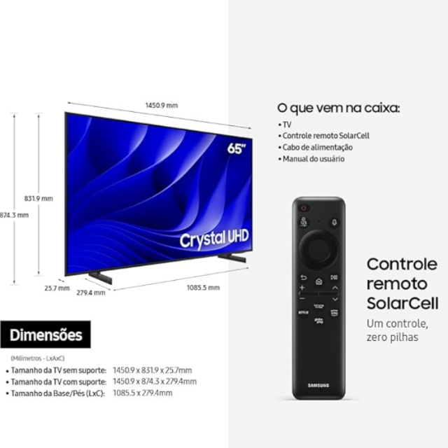 Imagine não apenas assistir a um filme, série ou jogo, mas mergulhar de cabeça na história, como se estivesse dentro da cena. Com a Samsung Crystal UHD 4K de 65″, essa imersão se torna realidade. Seu poderoso Processador Crystal 4K trabalha em sintonia com o HDR10+ e o Mega Contraste para revelar um mundo de cores vibrantes, sombras profundas e detalhes surpreendentemente nítidos. O resultado? Cada imagem vira um espetáculo à parte, seja um blockbuster de ação, uma série dramática ou aquele game que você tanto ama.